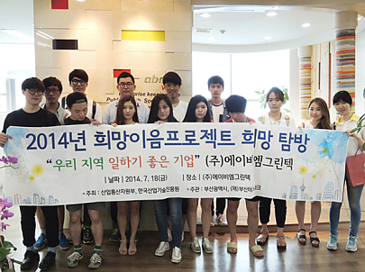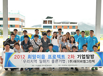 지식경제부가 주관하는 '우리지역 일하기 좋은기업'에 당사가 선정되어2011년 7월 8일과 15일에 일하기 좋은 기업 대학생 탐방단이 본사와 밀양공장을 견학하였습니다.(주)에이비엠