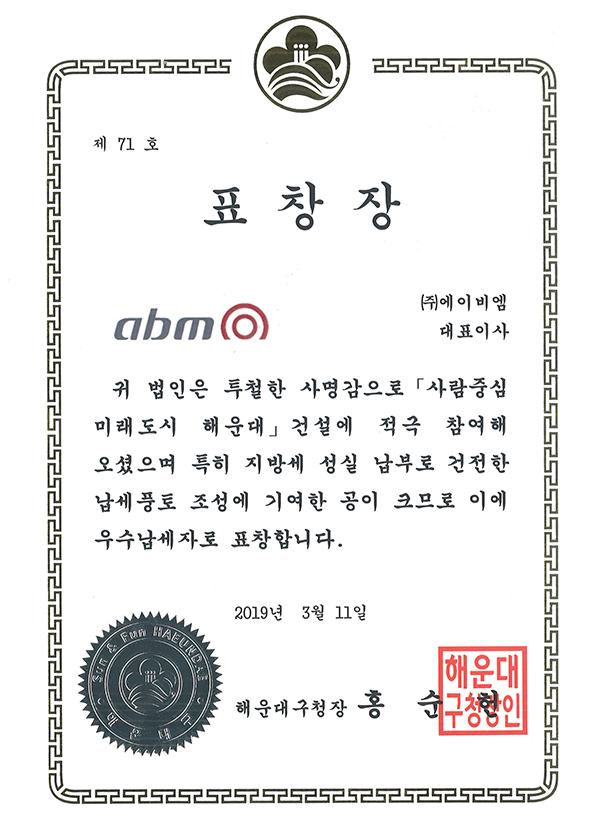 Commissioner of Haeundae-gu, Official Commendation Letter 2024-12-06 Major Awards 0 1258 2024.12.06 14:08 No. 71