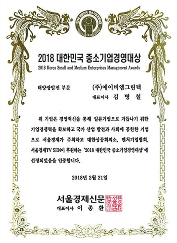 Korea's Small and Medium Enterprise Management Awards 2024-12-06 Major Awards 0 1307 2024.12.06 14:16 Photovoltaic power generation