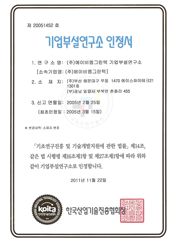 Certificate of Accreditation to the Corporate Affiliated Research Inst… 2024-12-06 Major Certifications 0 1407 2024.12.06 13:34 No. 20051452